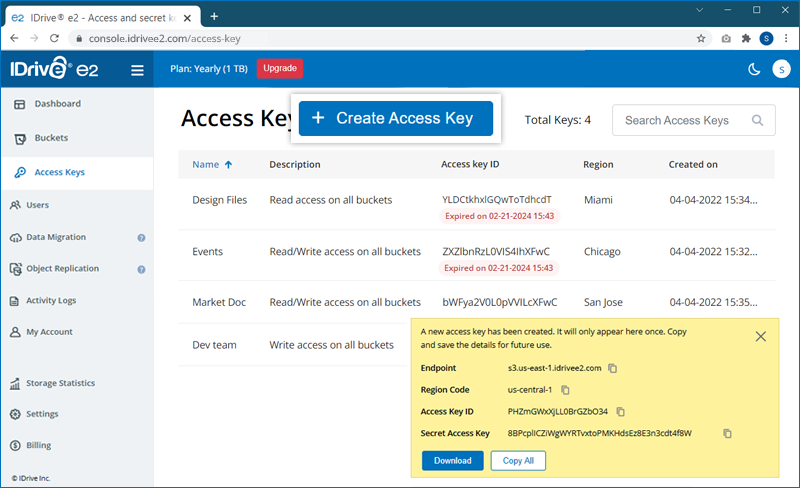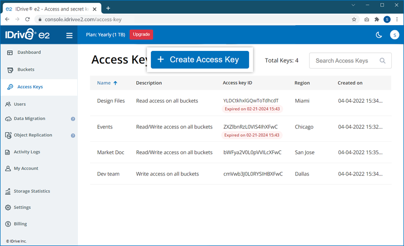 These keys can be generated from the Access Keys tab of the IDrive® e2 account.
