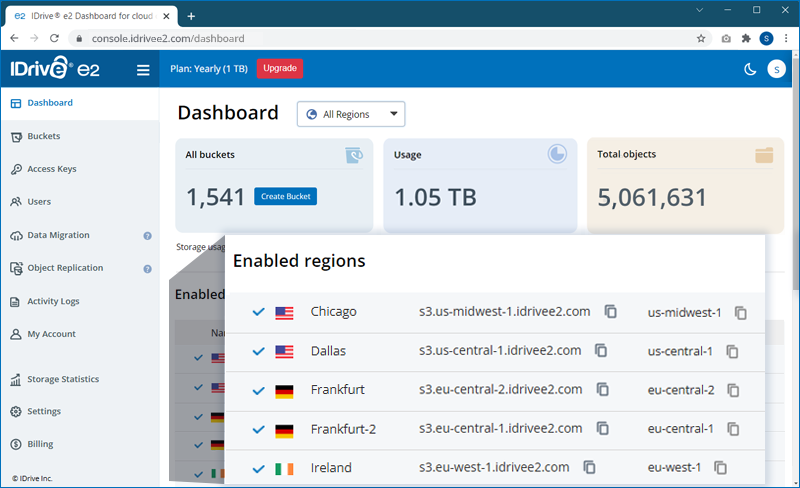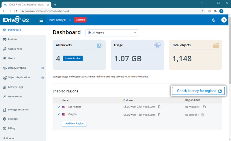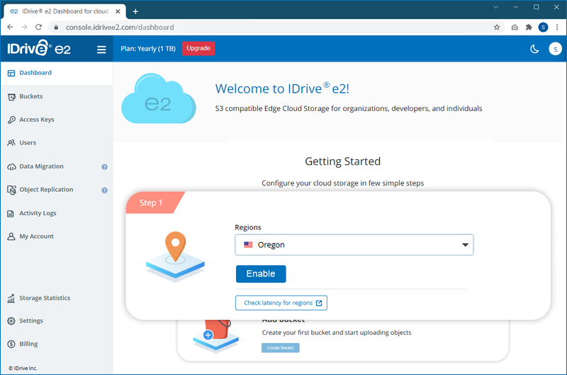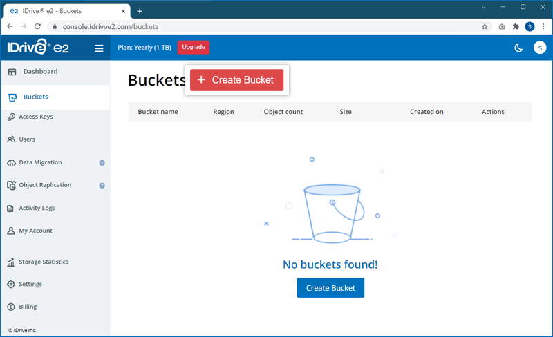 - Sign in to your IDrive® e2 account. The Dashboard tab will be displayed.