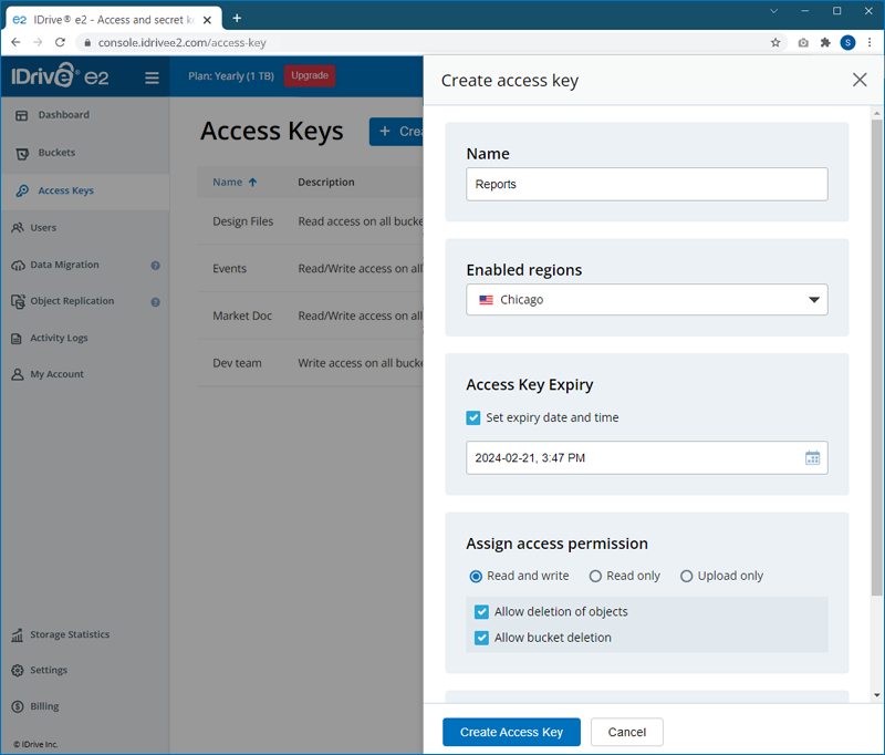 - Select the access permission for the access key.