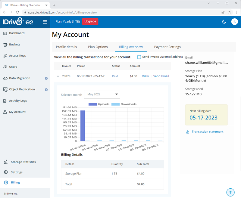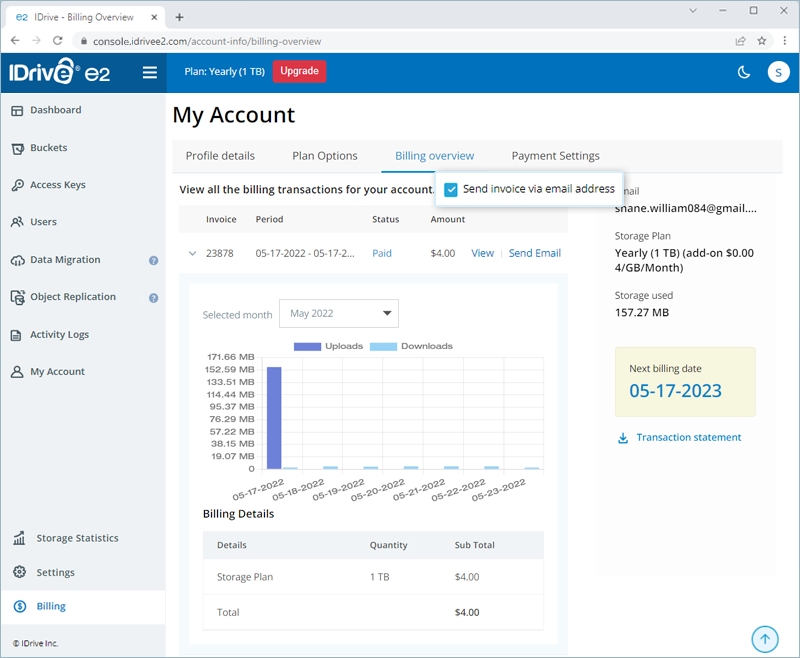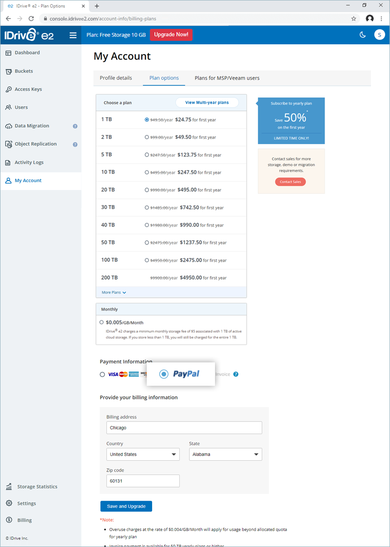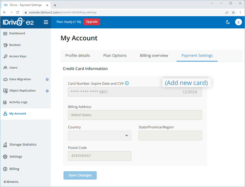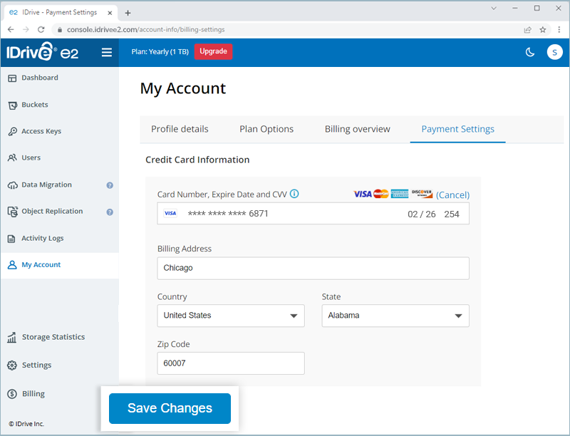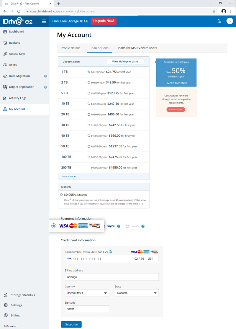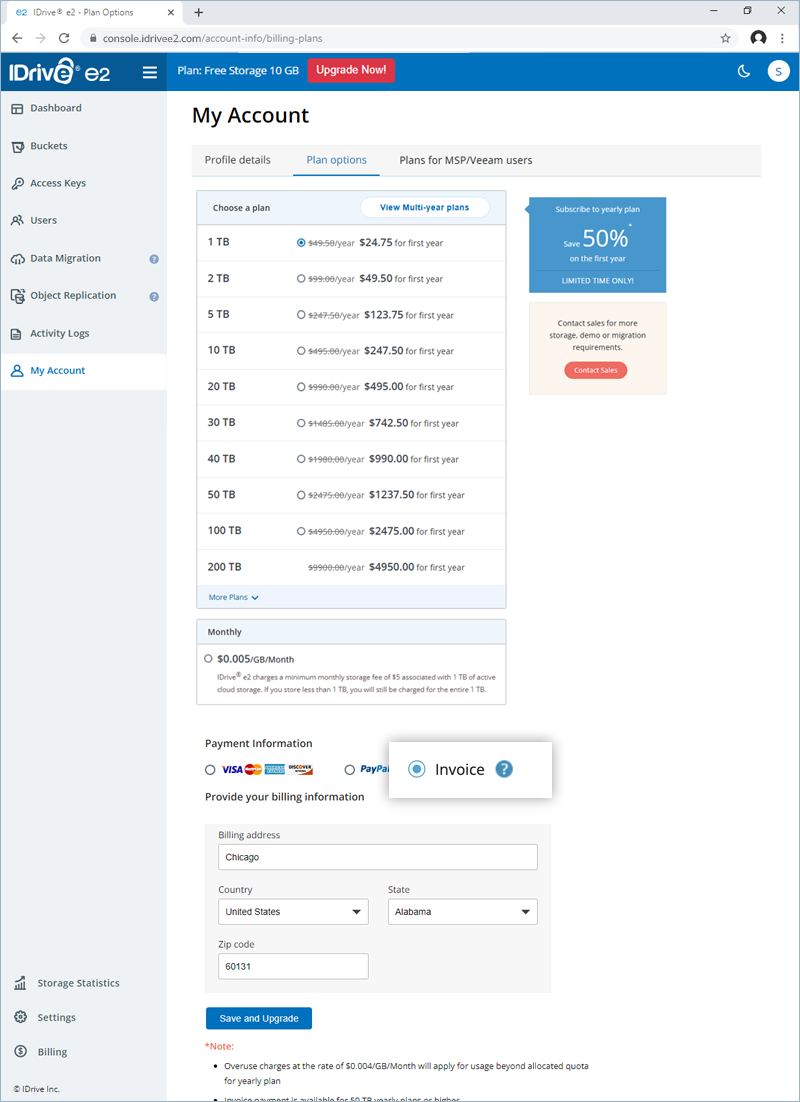 IDrive® e2 allows you to process payment via credit and debit cards. For plans higher than 50 TB, you can make the payment via check and bank wire transfer. Contact support to enable invoice payment for your account.