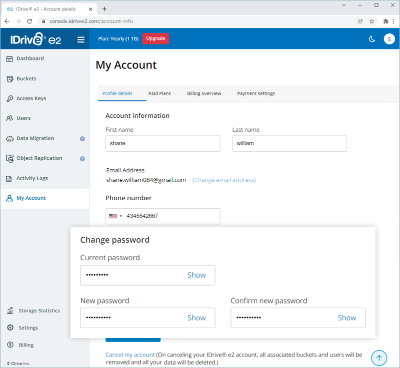 Note: On account cancellation, all your buckets, users, and data associated with your account will also be removed. You will no longer be able to access your IDrive® e2 account.