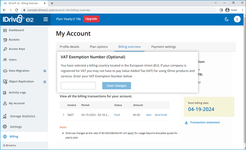 | Can I add VAT ID to my IDrive® e2 account? | |