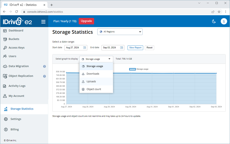 You can also select 'Downloads', 'Uploads', or 'Object count' to view related statistics.