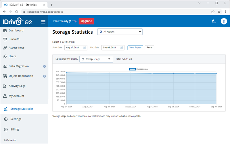 You can view your account storage, downloads, uploads, and object count statistics on the 'Storage Statistics' tab.