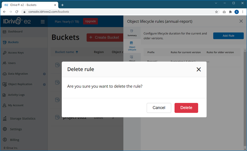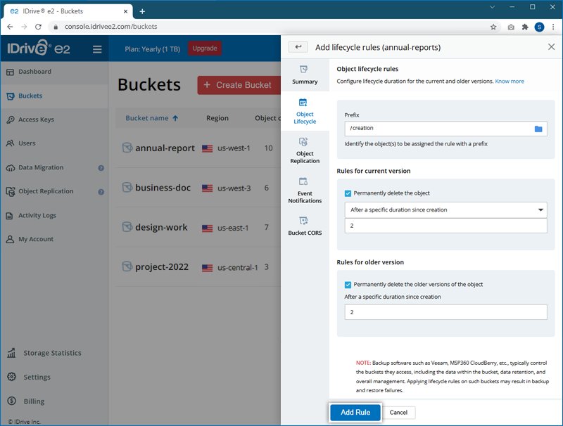 corresponding to a bucket. - Navigate to 'Object Lifecycle' and click 'Add Rule'.