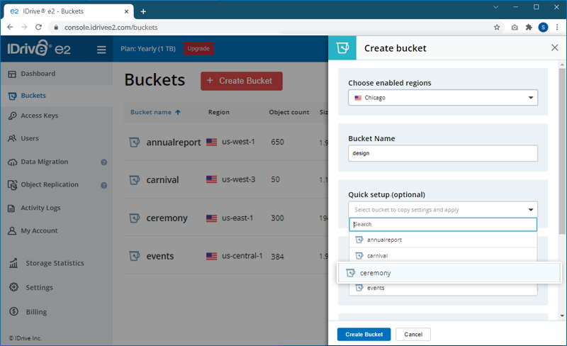 Note: If any alterations/changes are made in the settings, it will overwrite the copied settings. - Click 'Create Bucket'. A new bucket will be created with the settings from the existing bucket.