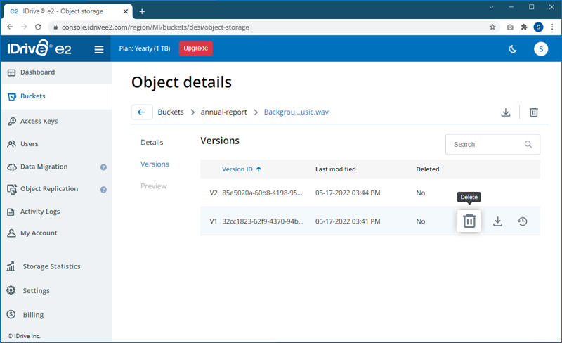 - Click on the object name to view 'Object details' > 'Versions'.