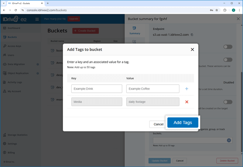 Note: You can add upto 50 tags for a bucket.