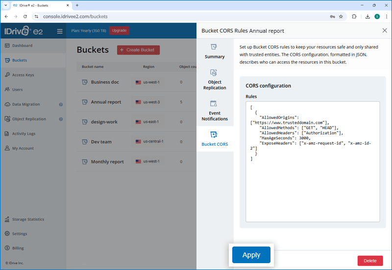 - Add required CORS configuration in a JSON format and click 'Apply'.