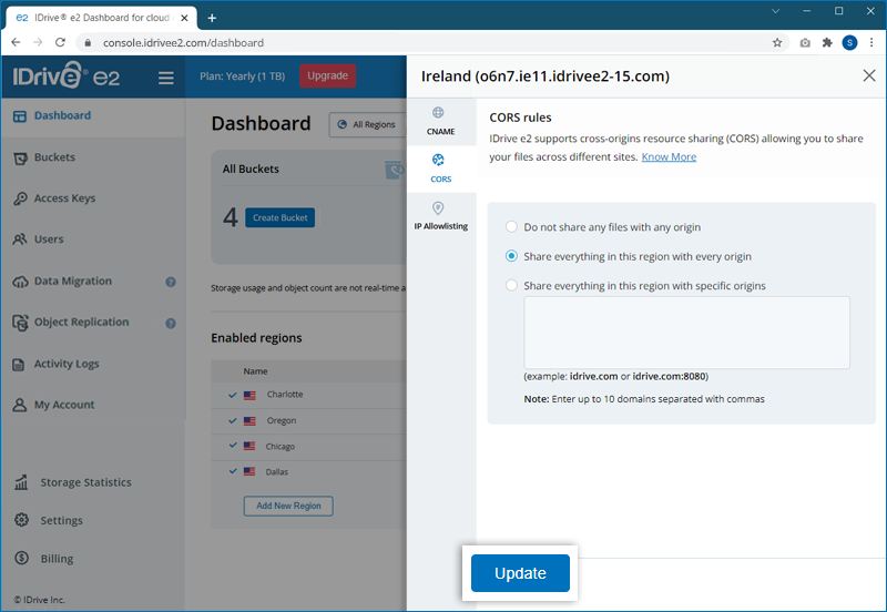 IDrive® e2 implements Cross-Origin Resource Sharing (CORS) headers to indicate any origins other than its own from which a browser should permit loading resources.