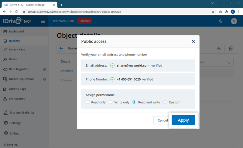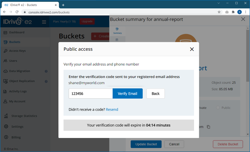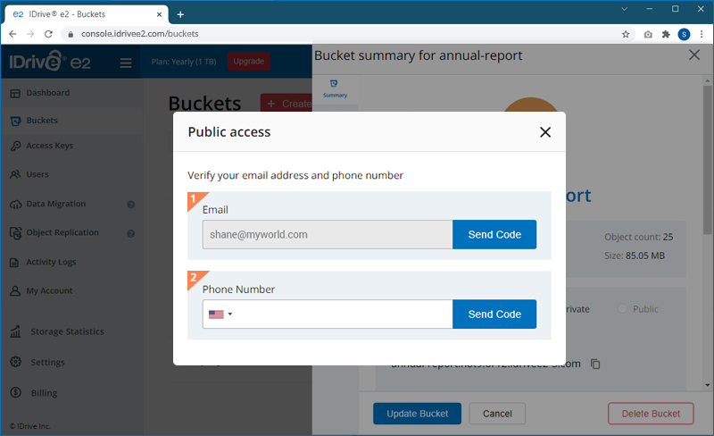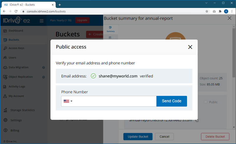 To assign public access to a bucket, you must verify your email address and phone number via a one-time verification code.
