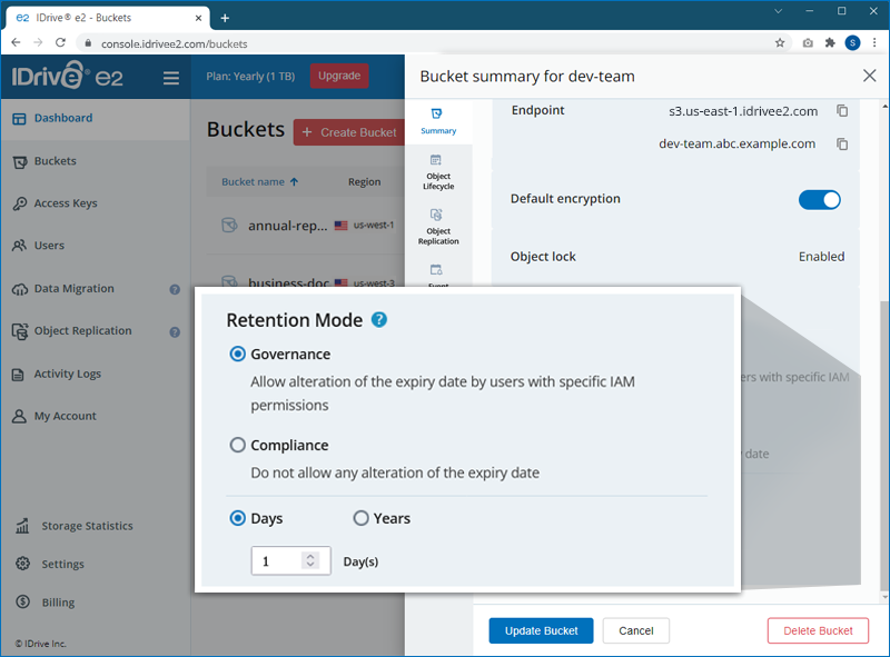- If you wish to lock modification or deletion of any files for a specific duration, enable 'Object Locking'.