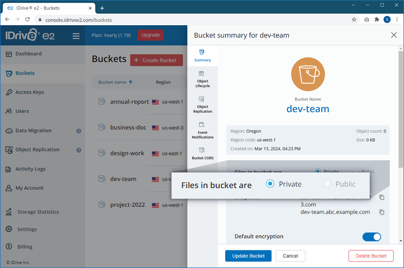 Effective from 11-01-2024, IDrive® e2 has updated its default policy regarding bucket access. For all accounts created after this date, the ability to set a bucket as public is disabled by default.