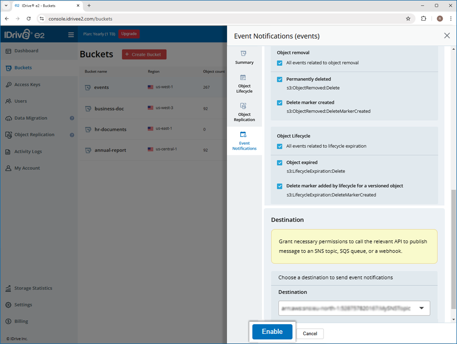 You can add event notifications to a bucket after its creation or through the settings tab.