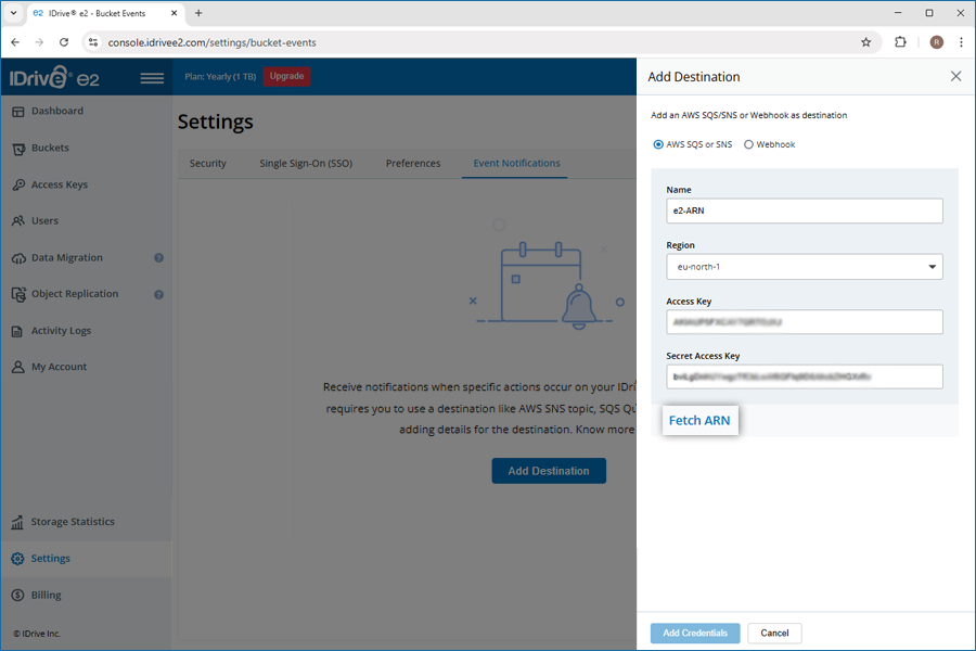 - Navigate to 'Event Notifications' and click 'Add Destination'.