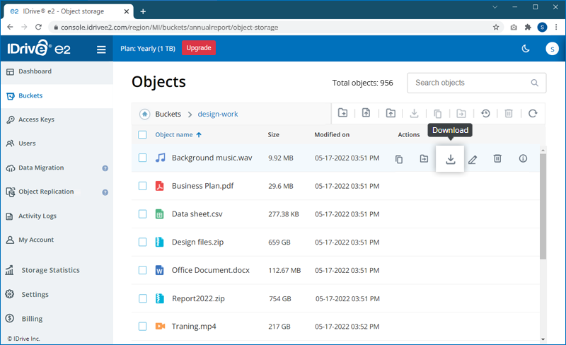 To download your files/objects via the IDrive® e2 web console,