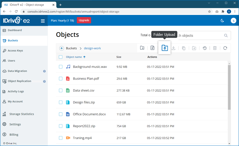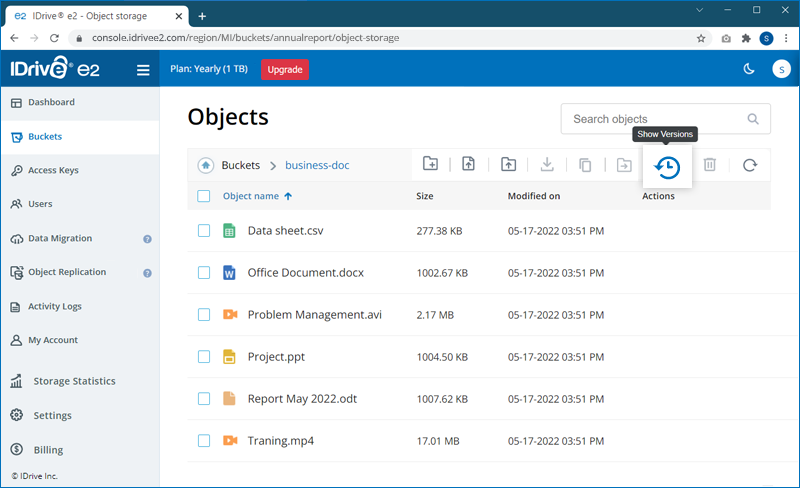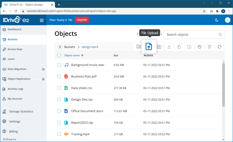 The data you store in your IDrive® e2 account is designated as objects and are assigned metadata and a unique identifier. The size of an object may vary from a few bytes to several gigabytes.