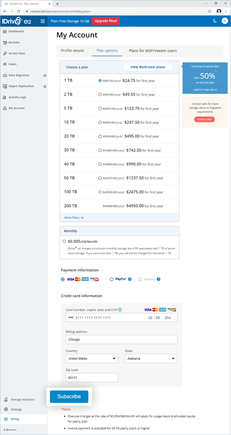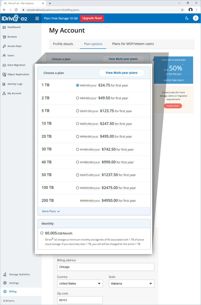 Yes, IDrive® e2 allows you to upload data beyond the allocated quota to ensure there are no disruptions to your operations. However, when you exceed account storage limit, there may be an overuse charge of $0.005/GB/Month. To avoid these charges, you may upgrade to higher storage plans.