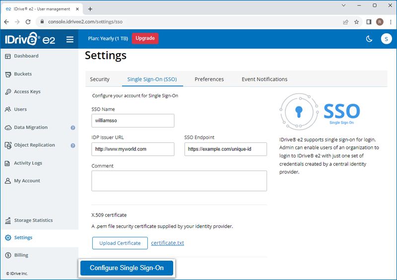 As an admin, you can enable your users to access IDrive® e2 by signing in to a central identity provider. To set up SSO with IDrive® e2, you need first to configure your identity provider and then configure SSO in IDrive® e2.