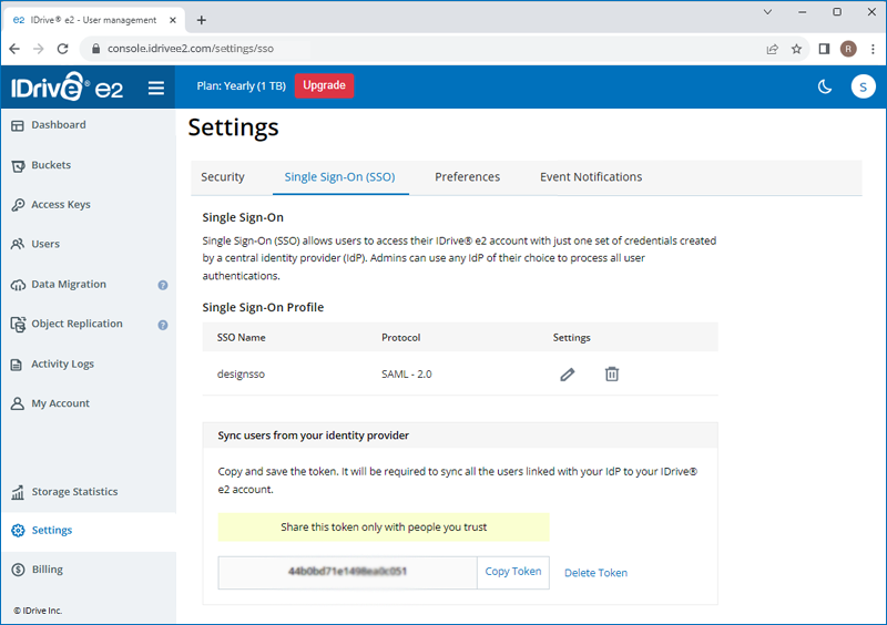The token will be required to sync all the users linked with your IdP to your IDrive® e2 account.