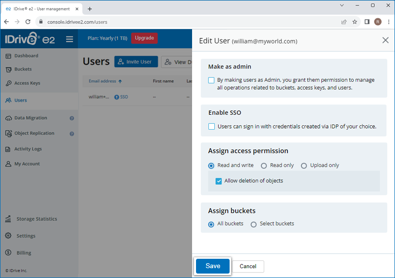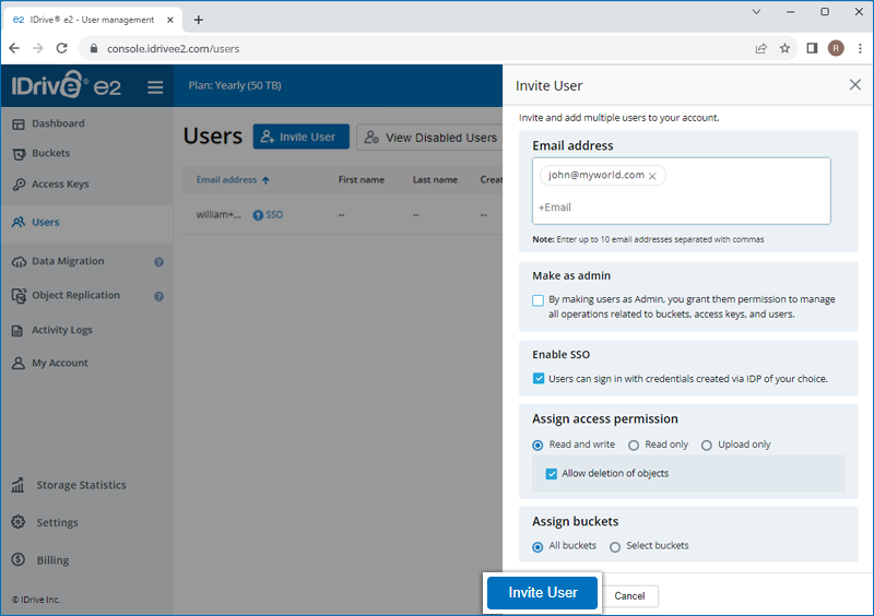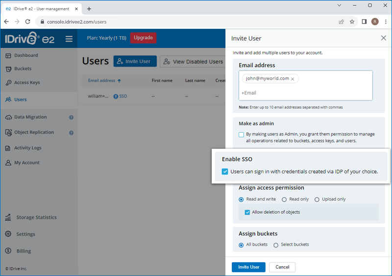 Admin of the IDrive® e2 account can enable SSO while inviting users. Alternatively, the admin can enable SSO for the existing users.